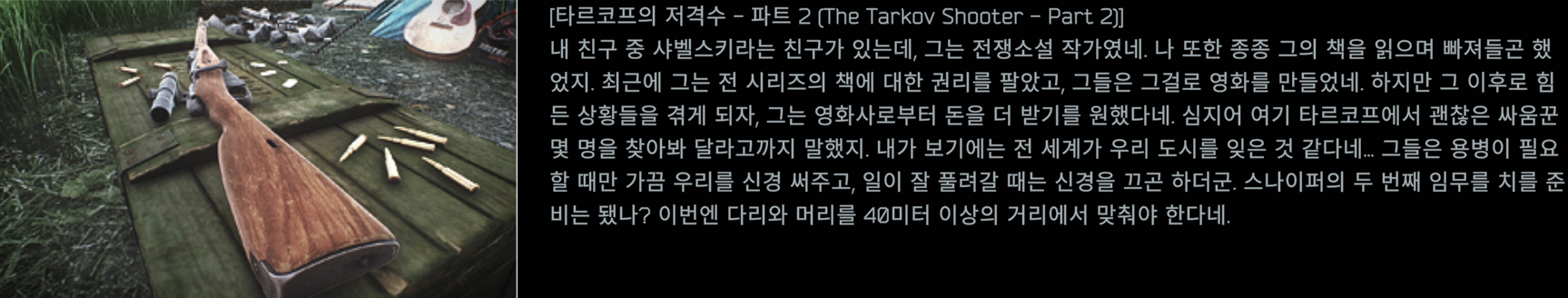 | [타르코프] 타르코프의 저격수 (The Tarkov shooter) - 파트1 (0) | 2025.09.24 |