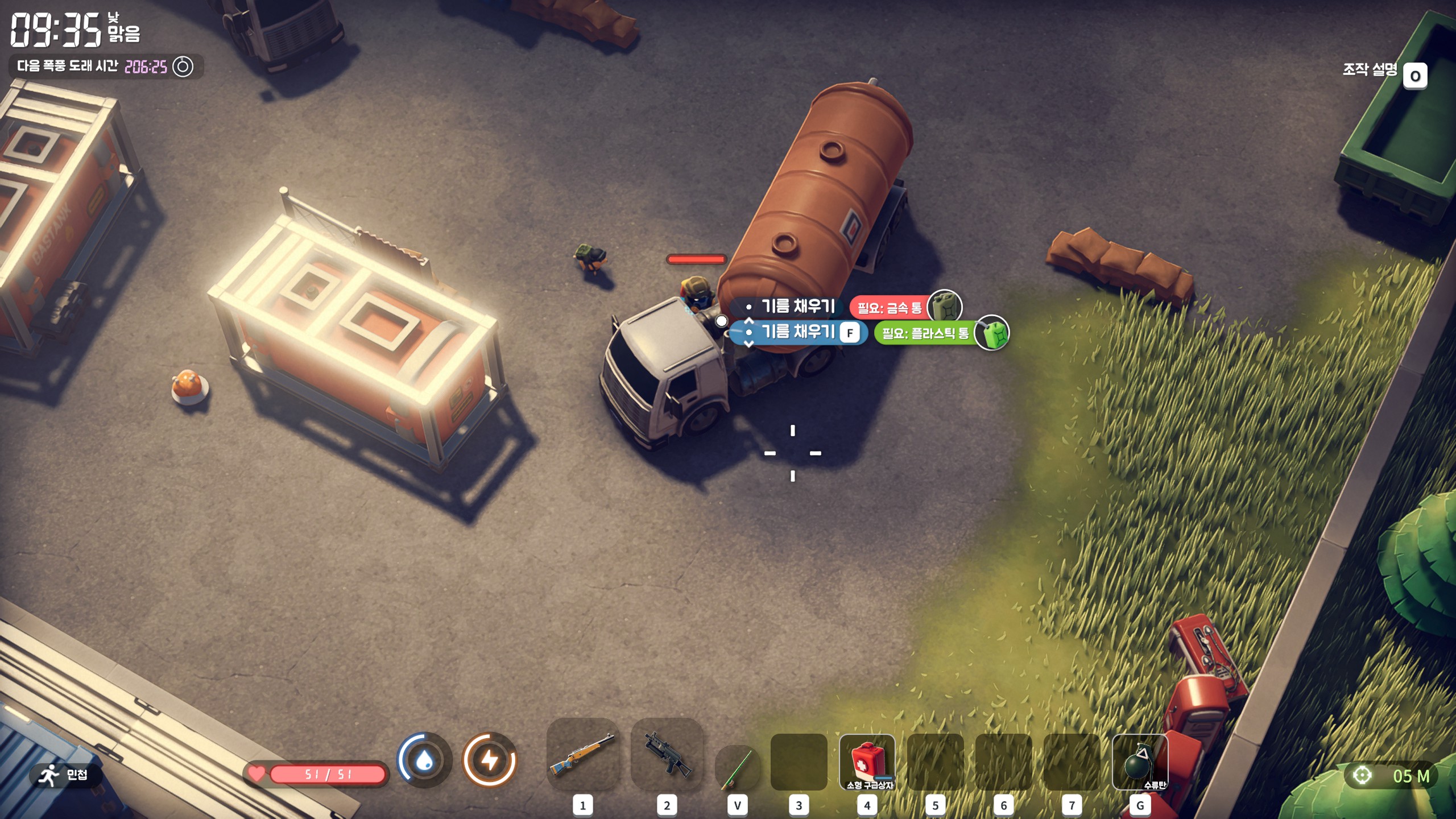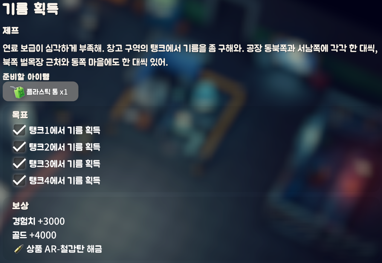 창고 구역 전역에 있는 탱크로리에서 기름을 뽑아내면 되는 퀘스트다.