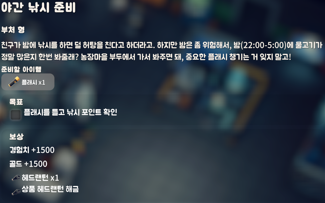 플래시를 지참 한 상태로 농장마을에 있는 낚시 포인트를 밤(22:00-05:00)에 확인하면 되는 퀘스트다.