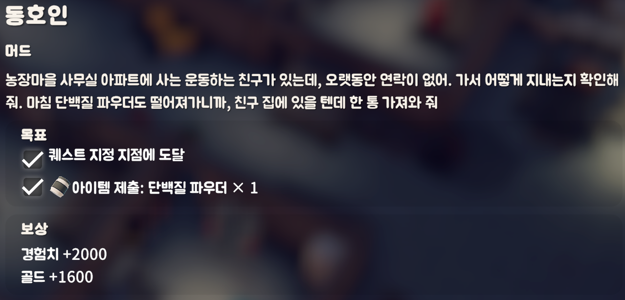 농장마을 중앙쯤 위치 해 있는 사무실 아파트 내부에 있는 방을 확인하면 되는 퀘스트다.