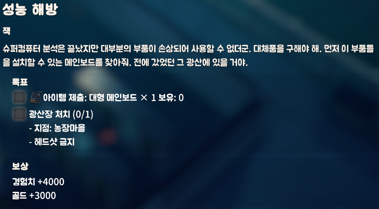 숨겨진 채굴장 내부에 있는 [대형 메인보드]를 가져다 주면 되는 퀘스트다.