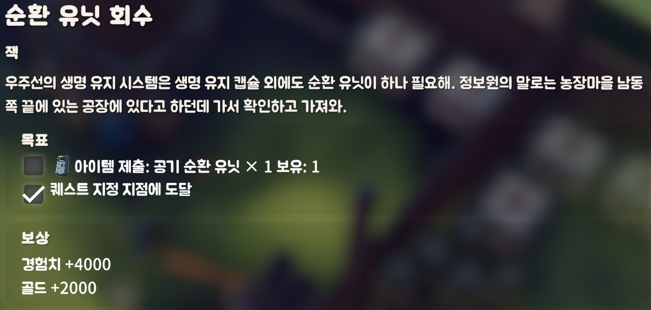 농장마을의 화학 공장에서 [공기 순환 유닛]을 가져다 주면 되는 퀘스트다.