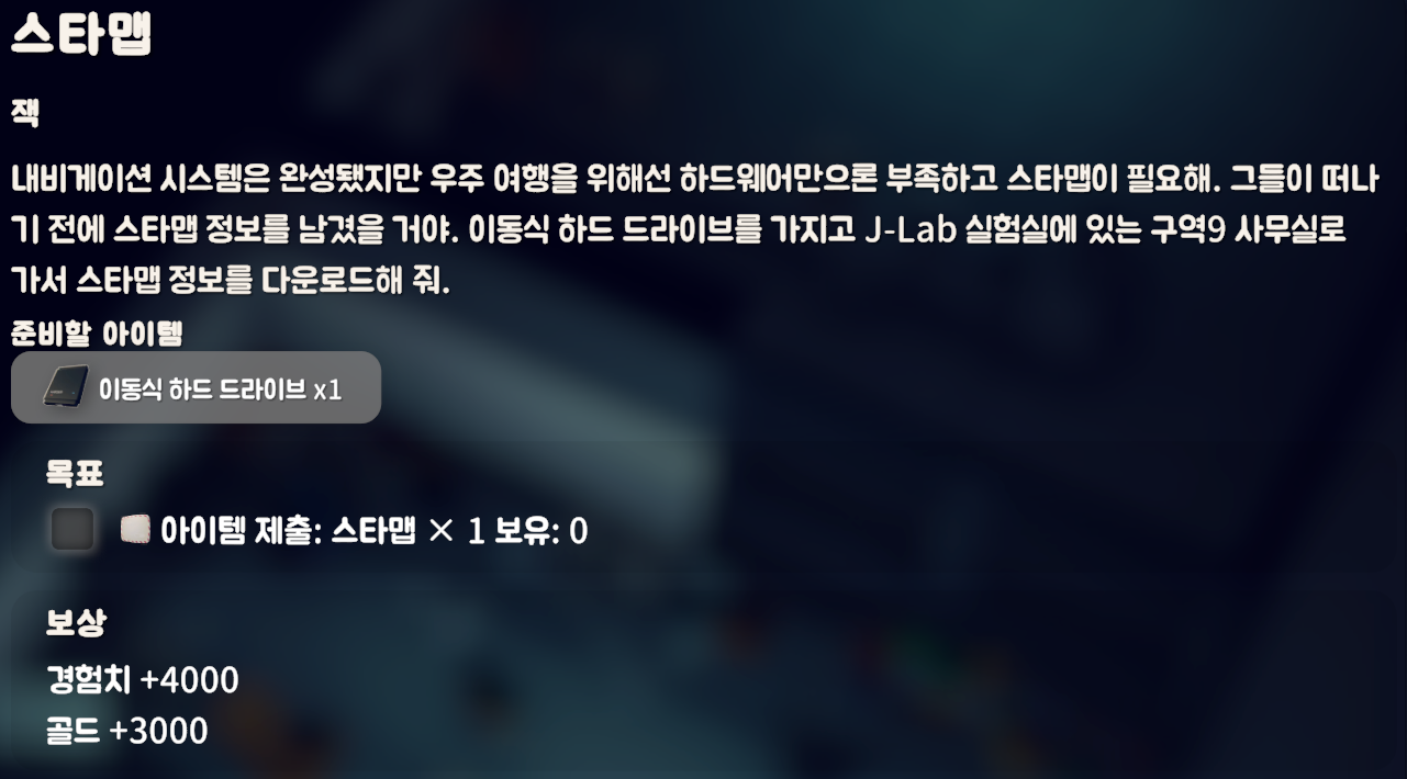 연구소 내부 컴퓨터에서 [이동식 하드 드라이브]로 정보를 받아오면 되는 퀘스트다.