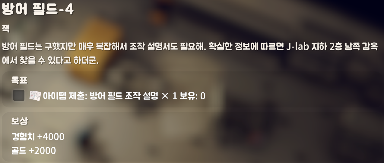 연구소 지하2층 감옥에 있는 [방어 필드 조작 설명]을 가져가면 되는 퀘스트다.